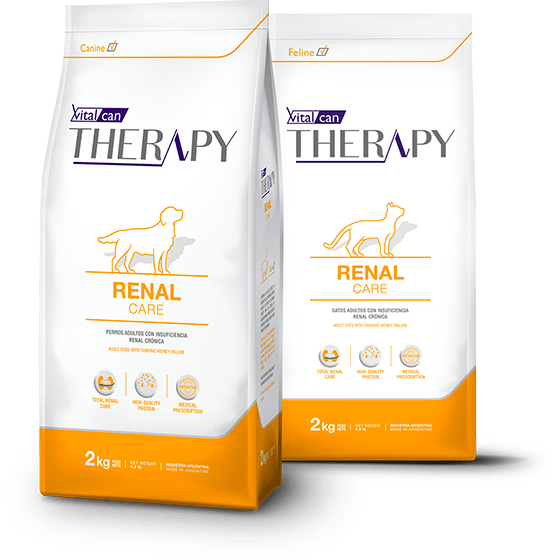VITALCAN THERAPY RENAL CARE es un alimento de prescripción para perros y gatos adultos con enfermedad renal crónica (ERC). Su bajo contenido de fósforo y moderada cantidad de proteínas de alto valor biológico y digestibilidad, contribuye al tratamiento de esta afección.