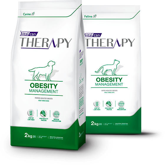 VITALCAN THERAPY OBESITY MANAGEMENT es un alimento de prescripción para perros y gatos adultos obesos o con sobrepeso. Este alimento, formulado con un reducido nivel de calorías y un adecuado aporte de fibras dietarias, colabora en el descenso del peso corporal del animal.