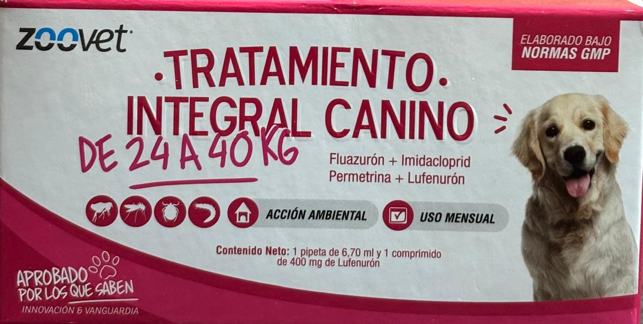 Pulguicida y garrapaticida. Repelente de moscas y mosquitos. Aplicar una pipeta (vía tópica) y conjuntamente se administran 1 o 2 comprimidos (vía oral) de acuerdo al peso de cada animal. Intervalo entre dosis: Cada 30 días. Cajas individuales con pipeta y comprimido/s, según corresponda por kilaje.