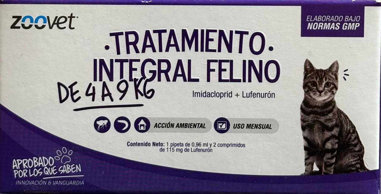 Aplicar una pipeta (vía tópica), y conjuntamente se administran 1 o 2 comprimidos (vía oral) de acuerdo al peso de cada animal. Intervalo entre dosis: Cada 30 días. Cajas individuales con pipeta y comprimido/s, según corresponda por kilaje.